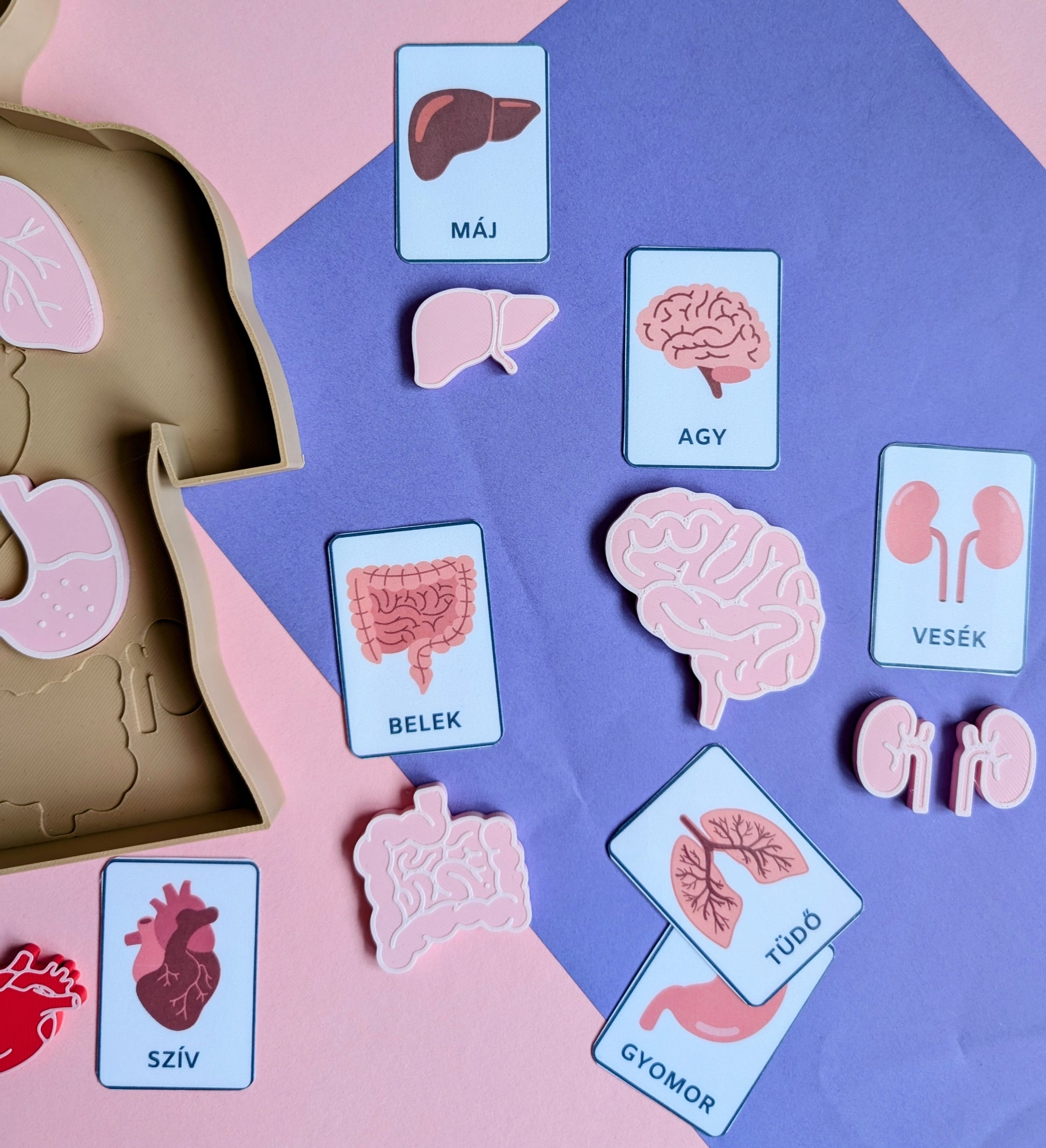 Emberi test oktatótálca kivehető szervekkel és tanulókártyákkal