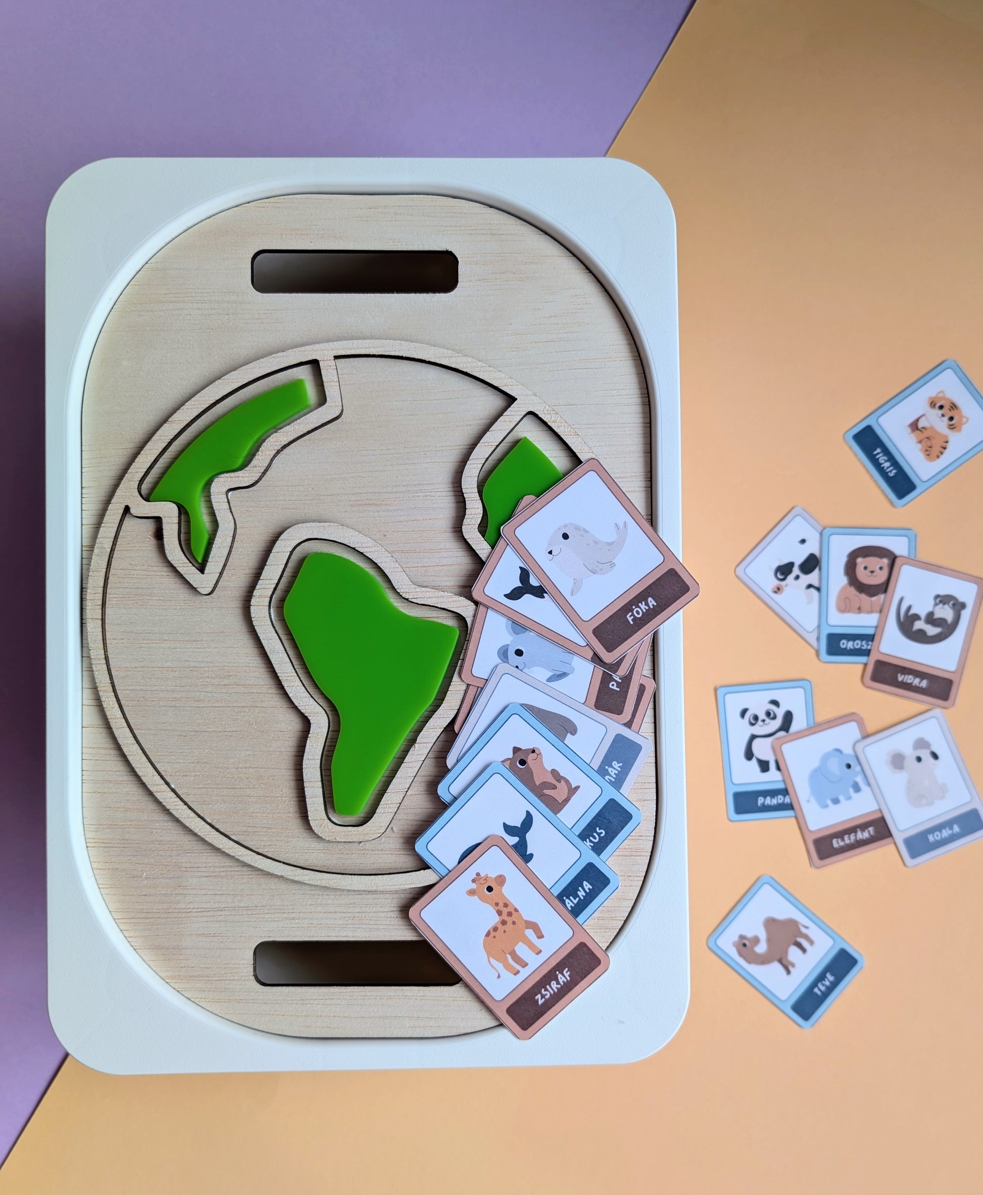 A gyerekek először kirakhatják a kontinenseket, majd a kártyák segítségével benépesíthetik a Földet. Hol él a panda? Melyik állat lakik a vízben? A játék során történetek születnek, kérdések merülnek fel, és a világ lassan érthetőbbé, ismerősebbé válik.